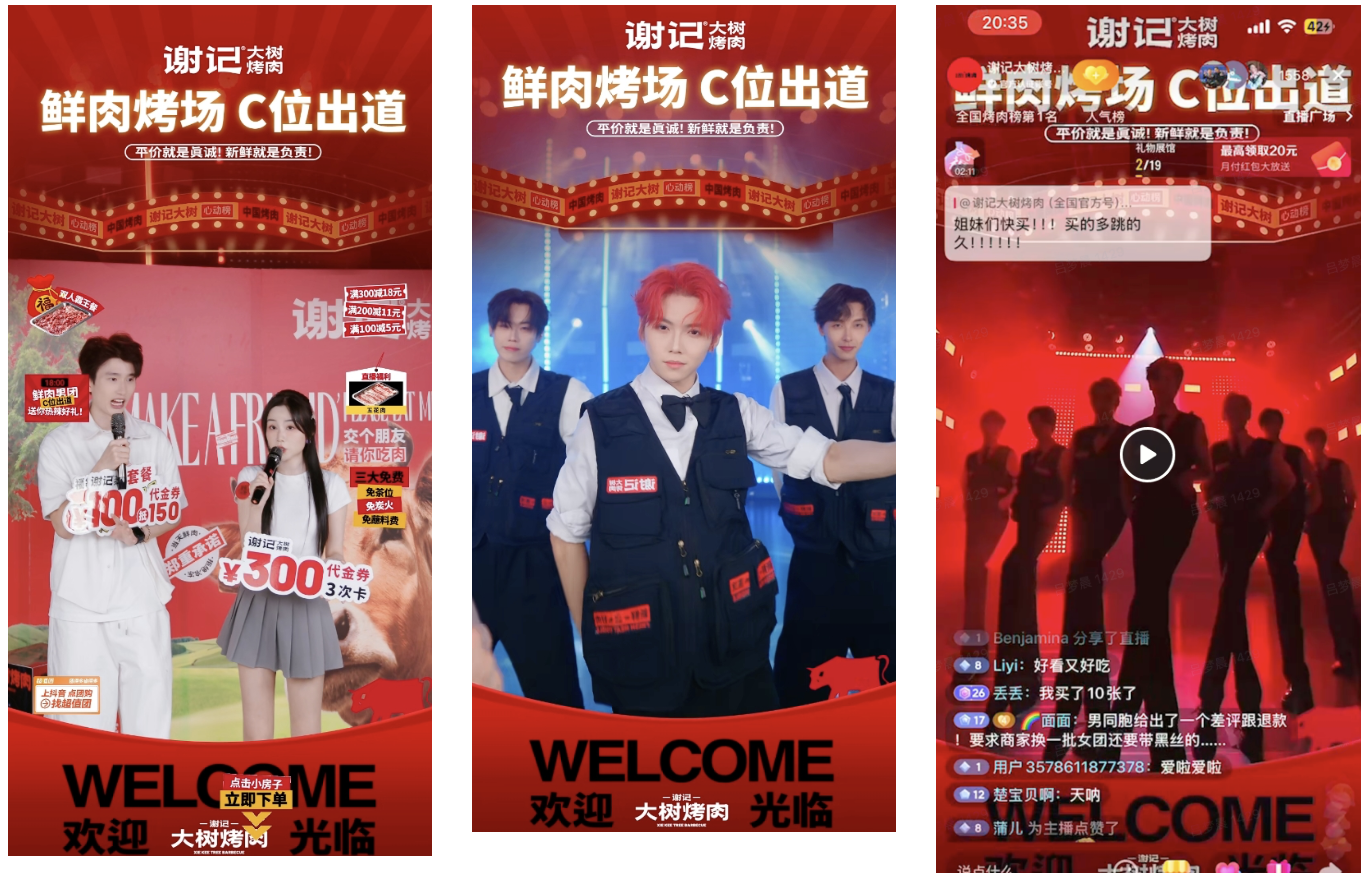 再基于客群中18-40岁女性占比超七成的结构特点,这种形式也能让消费者更容易理解产品特点,于是,谢记大树烤肉便迅速响应,邀请了一支“小鲜肉”男团入驻直播间。